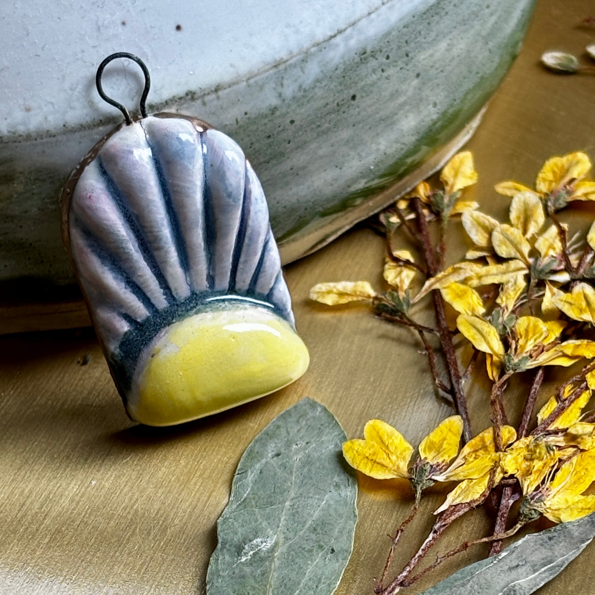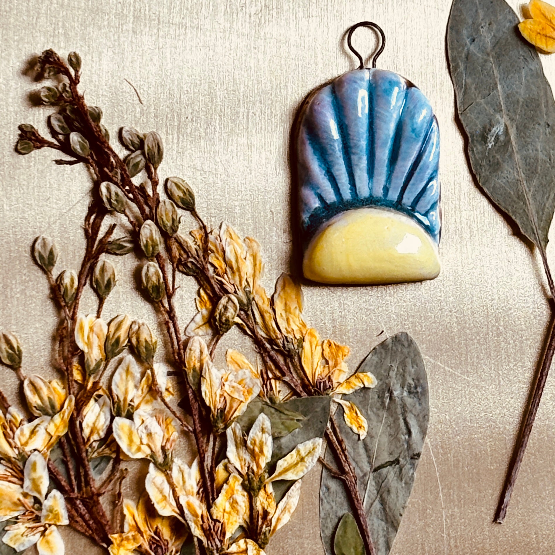 Carry the blue sky and better days with you. This hand-painted ceramic pendant features a stunning shell design, crafted with care from a piece of porcelain clay into a unique work of art. Each piece is one-of-a-kind, hand-carved and painted, so no two are exactly alike. Fired twice in a kiln and clear glazed for lasting beauty, this delightful porcelain pendant is perfect for your favorite necklace, decoration or plant flair. Pendant only. (3/4" x 1 1/2") I will be adding necklace options to the shop soon.