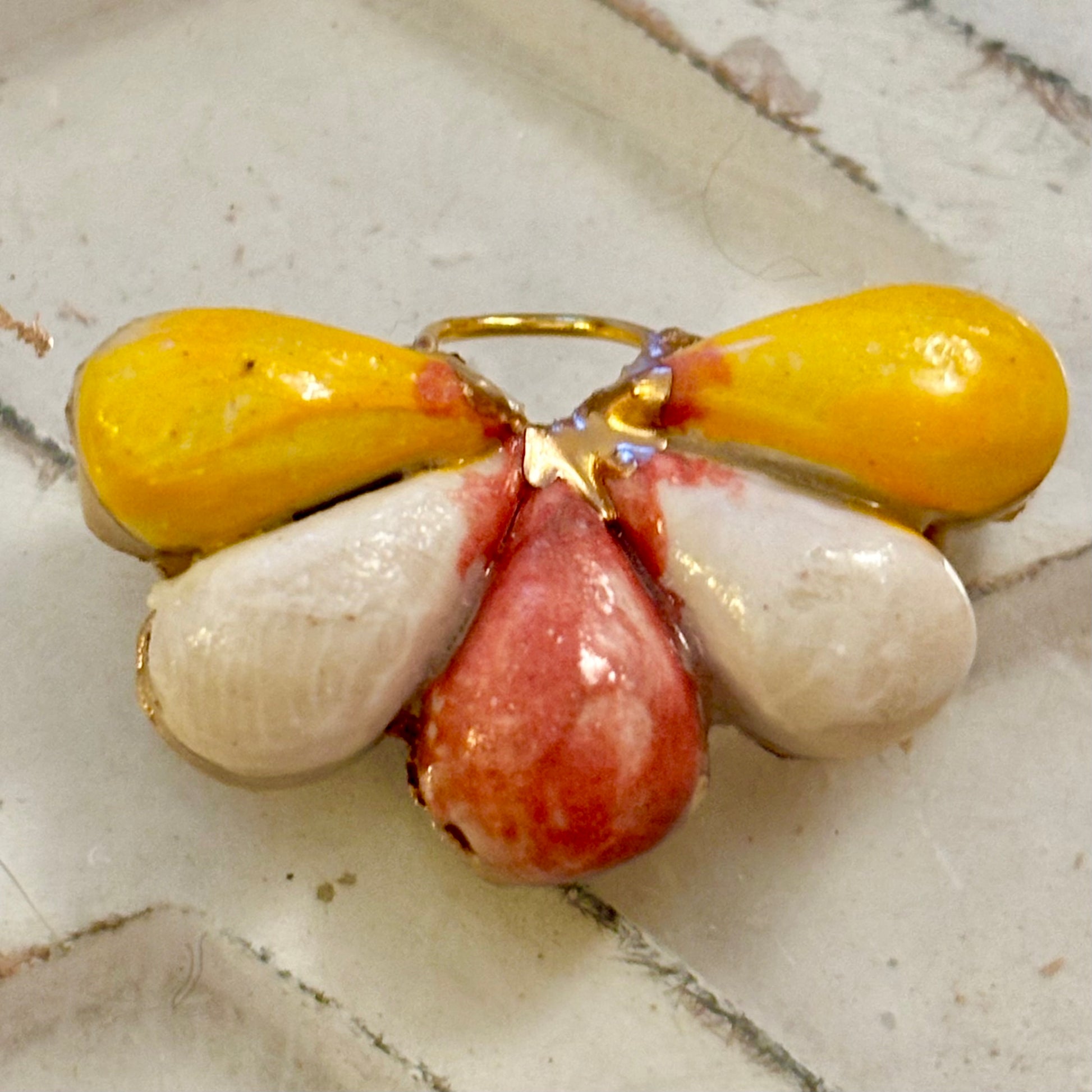 Brighten your day with this playful flower pop charm, meticulously hand-painted in cheerful yellow and pink hues with shimmering gold accents. Crafted from porcelain, each piece is uniquely one-of-a-kind, embracing its charming imperfections as part of its handmade story. Add a splash of fun and whimsy to your collection with this vibrant, delightful treasure.