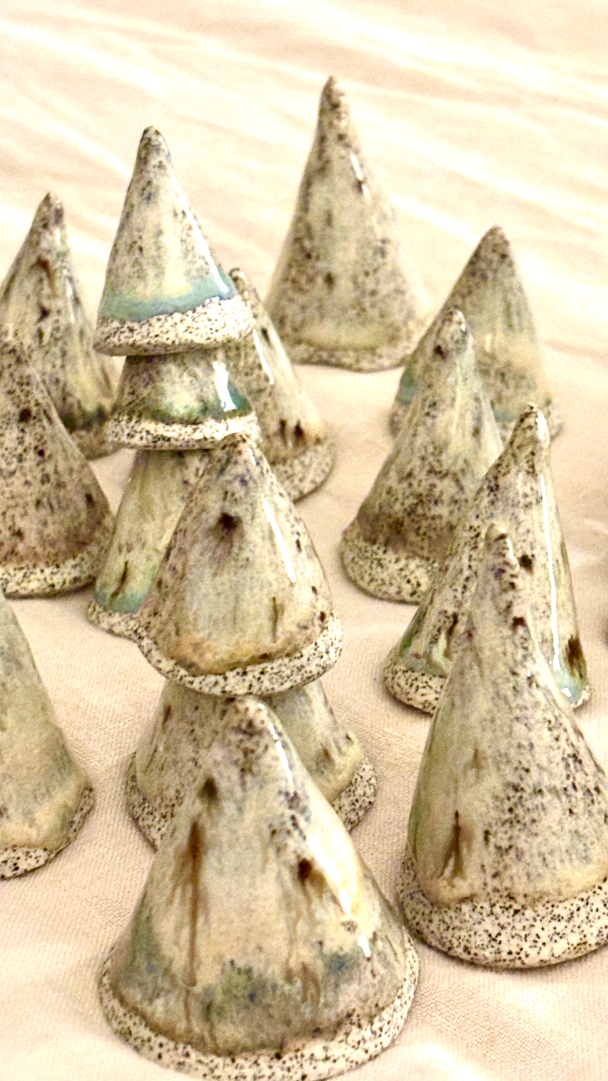They look beautiful grouped on a mantle, styled on a holiday shelf, tucked into a tiered tray, or added to a little winter village. Each tree is one of a kind with its own drips, speckles, and glaze variations that make the collection feel organic and collected over time.
