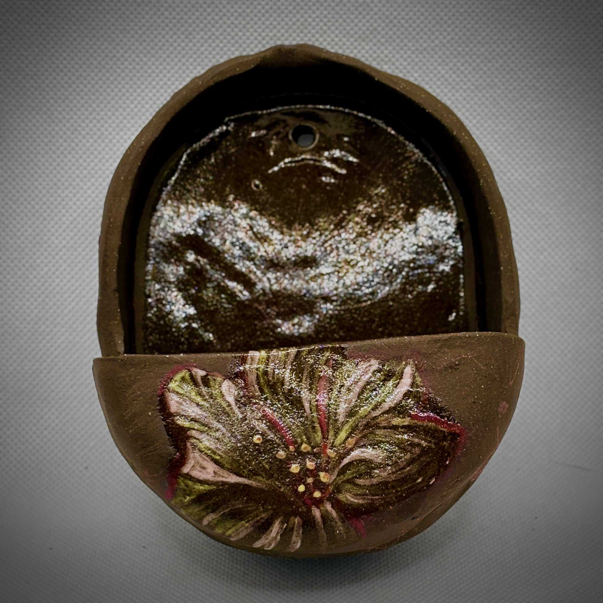 • Finish: Matte brown with hand-painted flower design