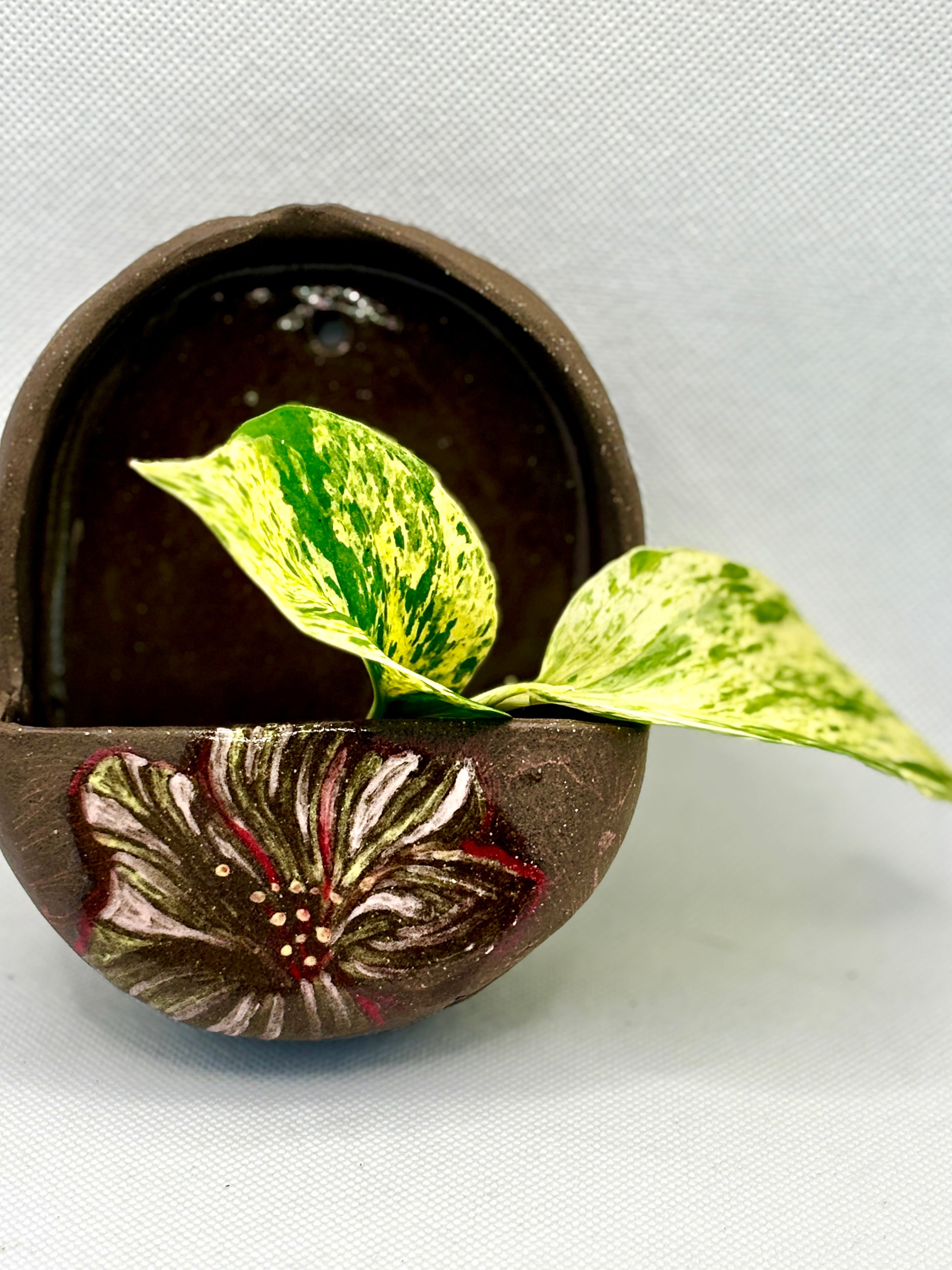 The deep espresso-brown glaze contrasts beautifully with the hand-painted floral motif, adding a soft botanical accent that feels both earthy and elegant. Its arched back and built-in hanging hole make it ideal for wall display—perfect for brightening up a kitchen, patio, or office nook.