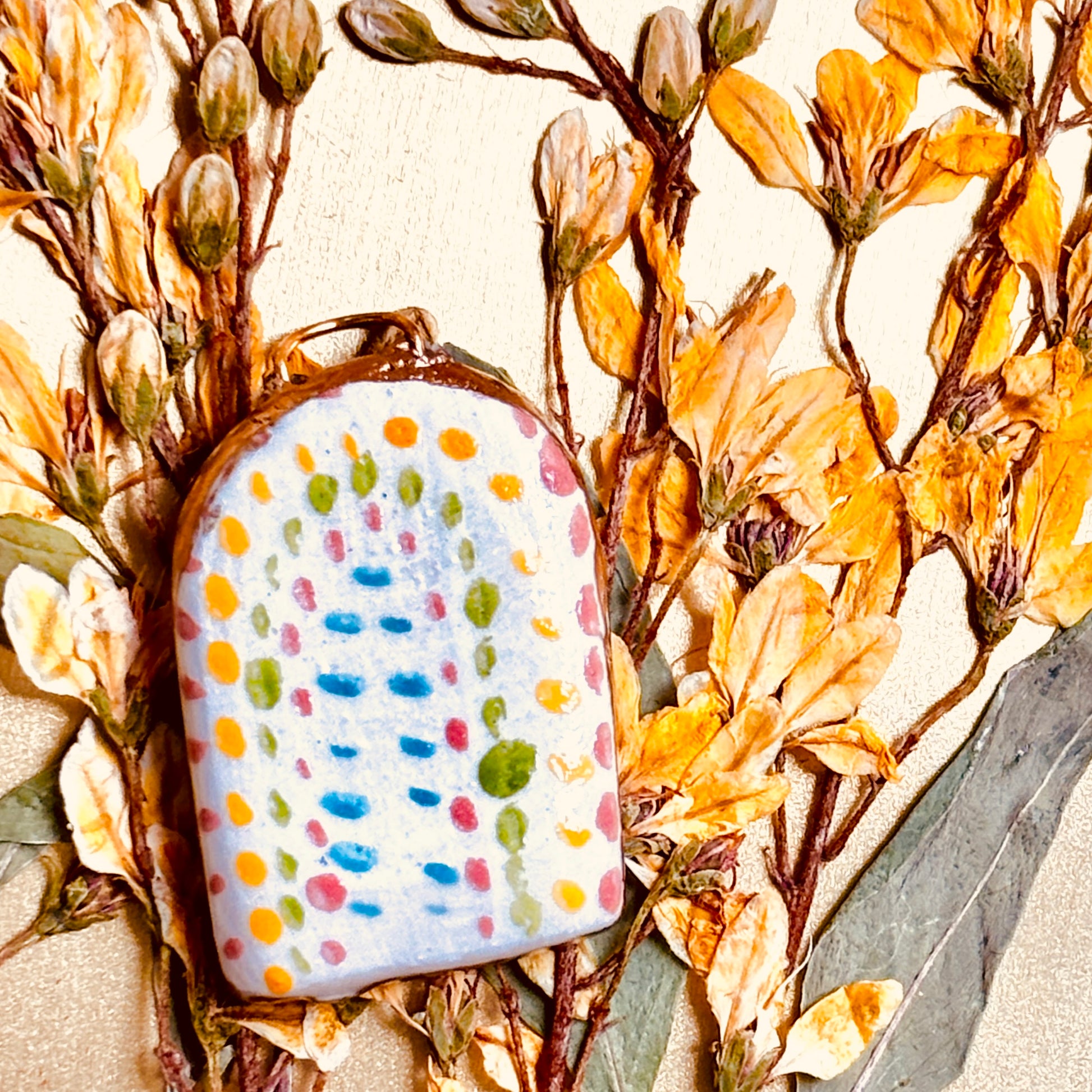 This playful hand-painted porcelain pendant features a cheerful Rainbow Brite design, dotted with bright, happy colors to bring a little magic to your day. Each piece is handmade, so no two are exactly alike—making every charm a one-of-a-kind treasure. Fired twice in a kiln and finished with a clear glaze for lasting shine, these fun pendants are perfect for wearing as a necklace, adding to a keychain, or hanging as a tiny decorative accent.